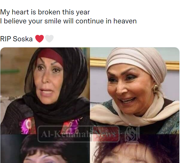 ونشر حساب باسم غريب صور للراحلة، معلقًا عليها: قلبي محطم هذا العام، أصدق أن ابتسامتك تستمر في السماء، ارقدي في سلامة سوسكا، مستخدمًا إيموجي القلب الأحمر.
