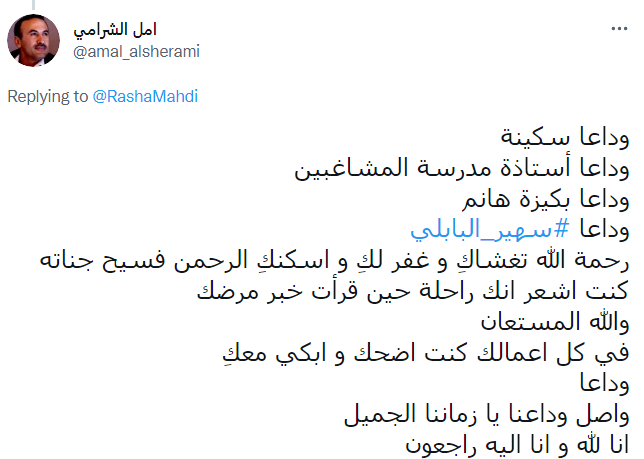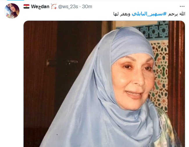 ونشر حساب آخر صورة للبابلي، معلقًا عليها: الله يرحم سهير البابلي ويغفر لها، إلى جانب أمل الشرامي، التي كتبت: وداعا سكينة.. وداعا أستاذة مدرسة المشاغبين.. وداعا بكيزة هانم.. وداعا سهير البابلي.. رحمة الله تغشاكِ وغفر لكِ واسكنكِ الرحمن فسيح جناته.. كنت أشعر أنك راحلة حين قرأت خبر مرضك.. والله المستعان.. في كل أعمالك كنت أضحك وأبكي معكِ.. وداعًا.. واصل وداعنا يا زماننا الجميل.. إنا لله وإنا اليه راجعون.