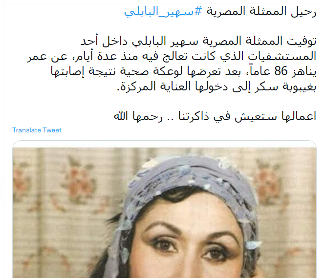 ونشرت نورا يوسف صورة للراحلة، معلقة عليها: رحيل الممثلة المصرية سهير البابلي، توفيت الممثلة المصرية سهير البابلي داخل أحد المستشفيات الذي كانت تعالج فيه منذ عدة أيام، عن عمر يناهز 86 عامًا، بعد تعرضها لوعكة صحية نتيجة إصابتها بغيبوبة سكر إلى دخولها العناية المركزة.. أعمالها ستعيش في ذاكرتنا.. رحمها الله.