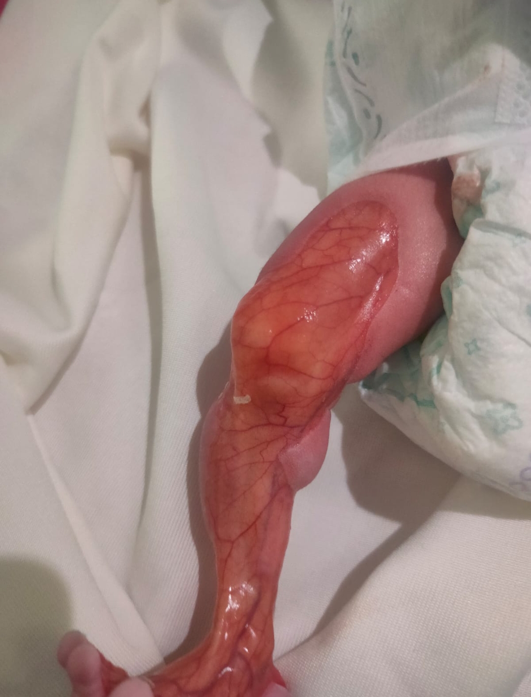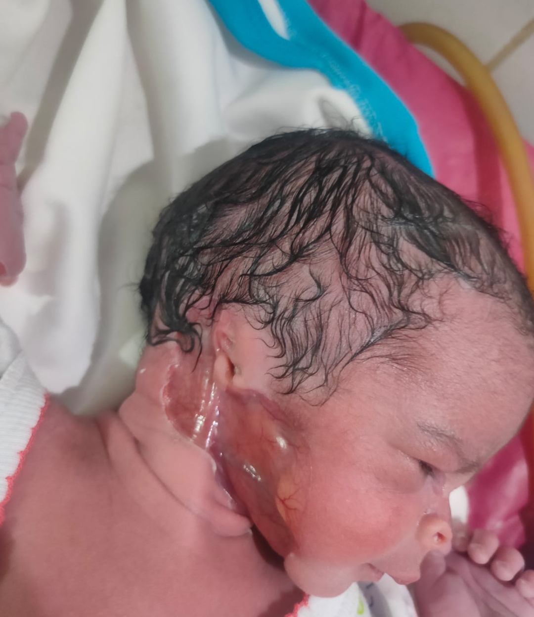 فوجئ الطبيب بخروج الطفل من رحم والدته وهناك بعض أجزاء في جسده مثل قدمه والرقبة من الناحية الخلفية، غير مغطاة بالجلد، بالنظر إليه تشعر وكأنك ترى دورته الدموية!.