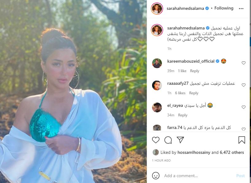 ونشرت سارة سلامة صورة جديدة لها عبر حسابها الخاص بموقع تبادل الصور والفيديوهات انستجرام، وعلقت عليها: أول عملية تجميل عملتها هي تجميل الذات والنفس (ربنا يشفى كل نفس مريضة).