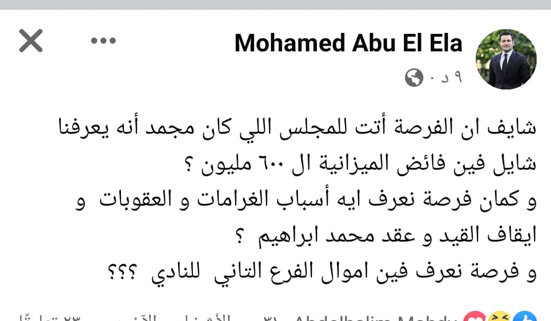 نشر أبو العلا عبر صفحته على موقع التواصل الاجتماعي فيس بوك، قائلًا: شايف أن الفرصة أتت للمجلس اللي كان مجمد أنه يعرفنا شايل فين فائض الميزانية ال 600 مليون؟.