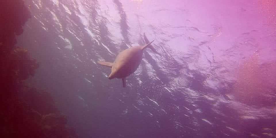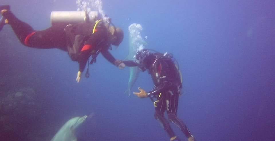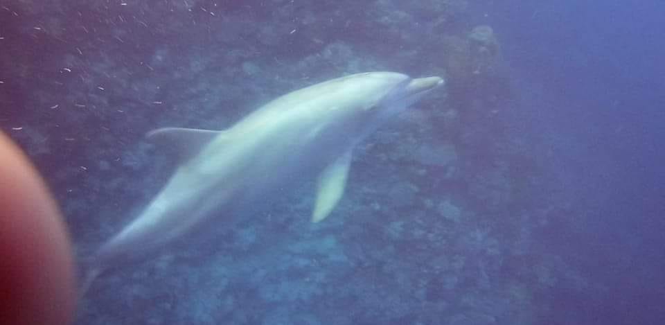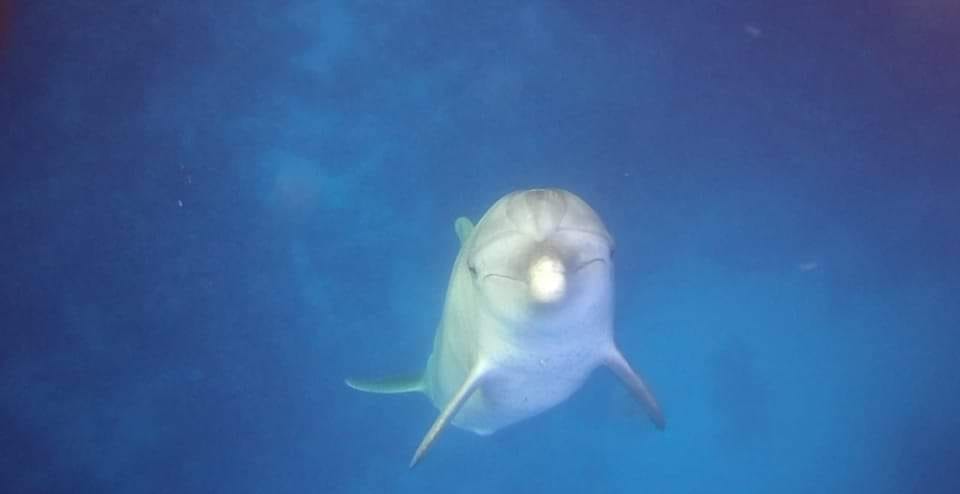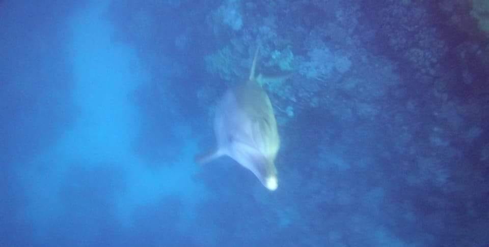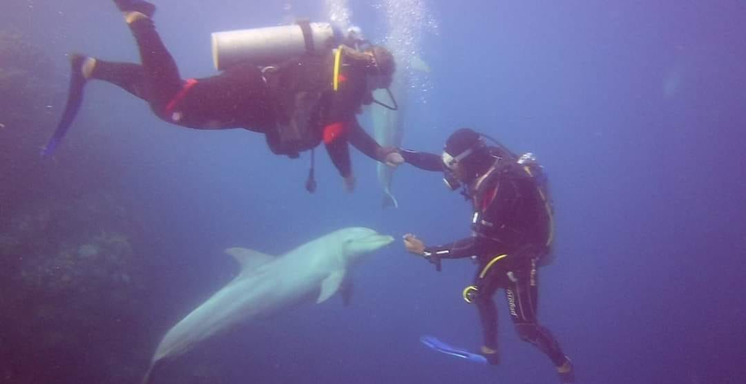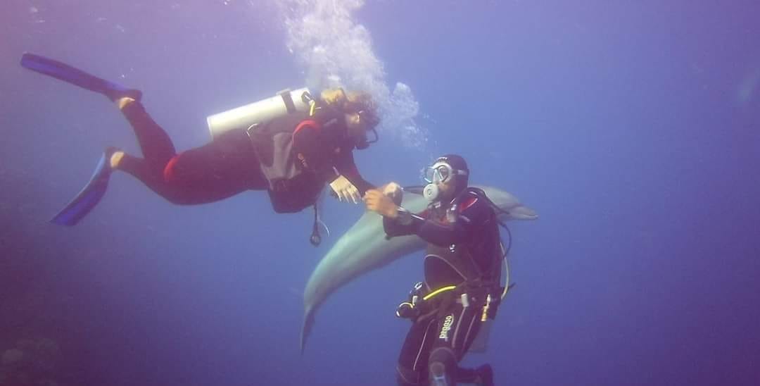 وظل الدولفين يسبح وسط الغطاسين، حيث قاموا بالتقاط الصور التذكارية له، ويعد من الكائنات البحرية الصديقة للإنسان.