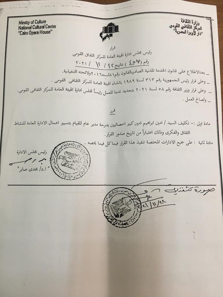 وجاء في القرار أن بعد الاطلاع على قانون الخدمة المدنية الصادر بالقانون رقم 81 لسنة 2016 ولائحته التنفيذية وقرار رئيس الجمهورية رقم 313 لسنة 1989 بإنشاء الهيئة العامة للمركز الثقافي القومي وقرار وزير الثقافة بتجديد ندبنا للعمل رئيسا لمجلي إدارة الهيئة العامة للمركز الثقافي القومي تقرر تكليف أمين إبراهيم، كبير إخصائيين بدرجة مدير عام للقيام بتسيير أعمال الإدارة العامة للنشاط الثقافي والفكري وذلك اعتبارا من تاريخ صدور القرار.