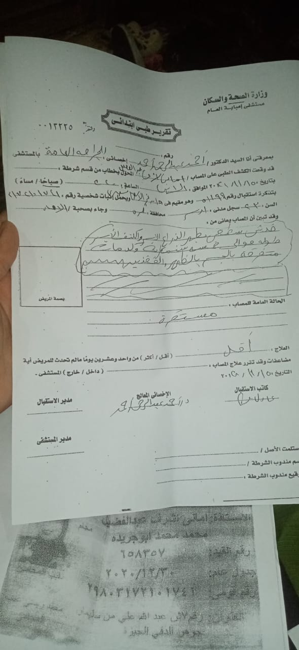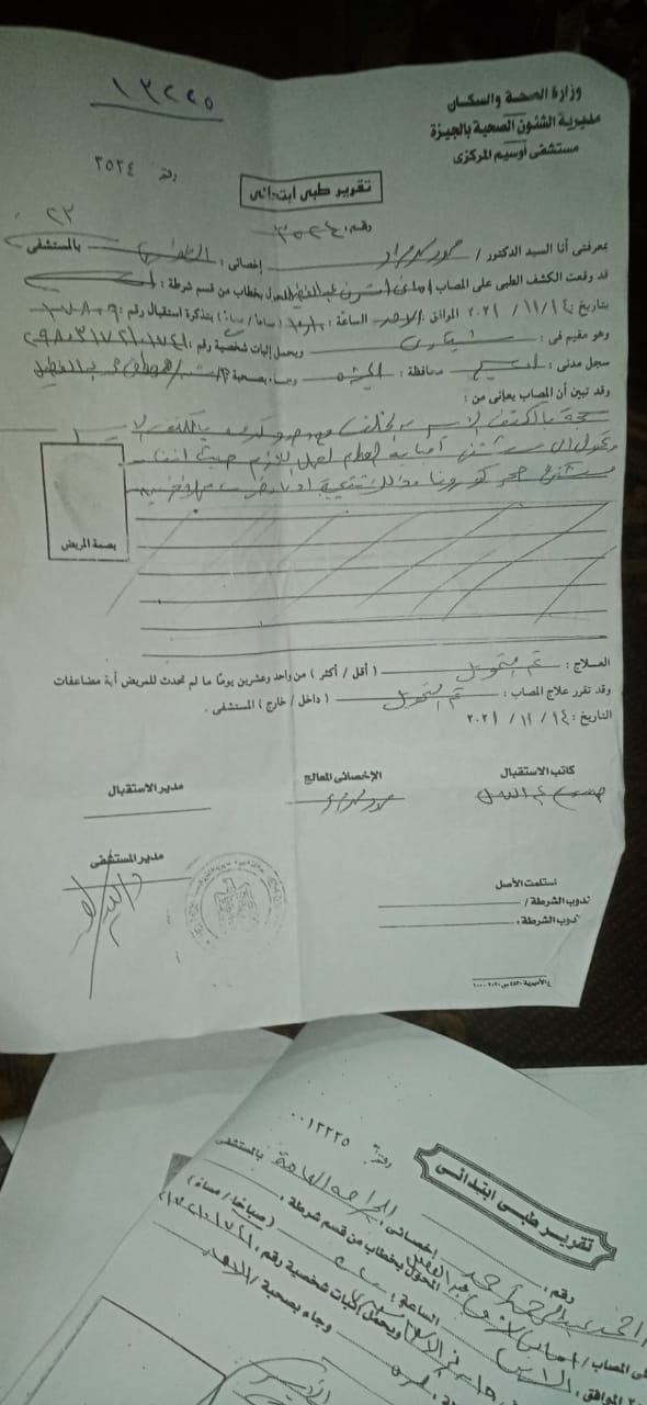 أوضح التقرير الطبي المبدئي بمستشفى مركز أوسيم، وجود سحجة بالكتف الأيسر من الخلف مع وجود كدمة بالكتف الأيسر، وتم تحويل المجني عليها إلى مستشفى إمبابة لعمل اللازم، حيث إن المستشفى حجر كورونا، وذلك لعمل التقرير النهائي نتيجة التعرض للضرب الاعتداء من الآخرين.