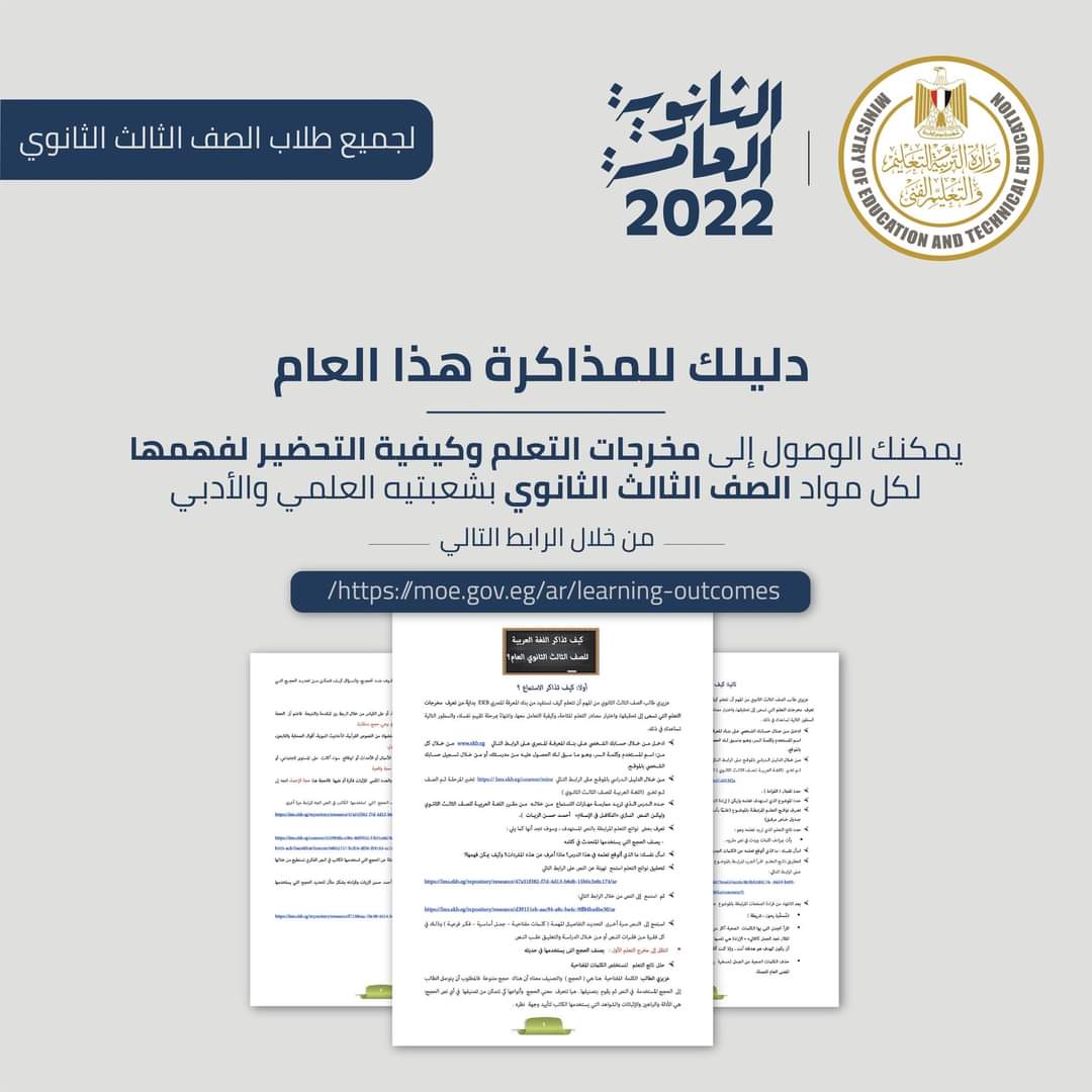 وأشارت الوزارة، عبر صفحتها الرسمية على موقع التواصل الاجتماعي فيسبوك، إلى أنه يمكن الوصول إلى خرجات التعلم وكيفية التحضير لفهمها لكل مواد الصف الثالث الثانوي بشعبتيه العلمي والأدبي، وذلك لمساعدة الطلاب على المذاكرة المنتجة التي تساعد على أفضل أداء لطرق التقييم الجديدة.