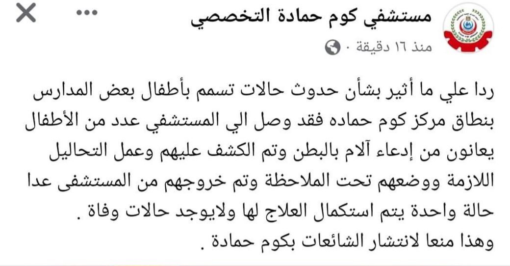 وقال بيان صادر عن مستشفى كوم حمادة التخصصي، قبل قليل: ردا على ما أثير بشأن حدوث حالات تسمم بأطفال بعض المدارس بنطاق مركز كوم حمادة، فقد وصل إلى المستشفى عدد من الأطفال يعانون من ادعاء آلام بالبطن، وتم الكشف عليهم وعمل التحاليل اللازمة ووضعهم تحت الملاحظة، وتم خروجهم من المستشفى عدا حالة واحدة يتم استكمال العلاج لها ولا يوجد حالات وفاة، وهذا منعا لانتشار الشائعات بكوم حمادة.