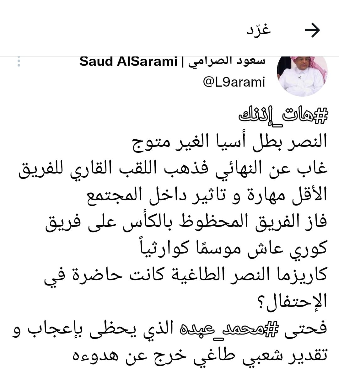 وكتب الصرامي عبر حسابه الشخصي على موقع التواصل الإجتماعي تويتر: النصر بطل أسيا الغير متوج، غاب عن النهائي فذهب اللقب القاري للفريق الأقل مهارة وتأثير داخل المجتمع.