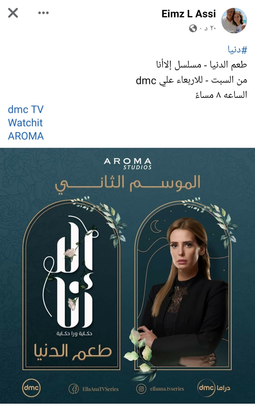 وكتبت إيمان العاصي منشورًا، عبر حسابها الشخصي بموقع التواصل الاجتماعي فيس بوك، جاء فيه: دنيا.. طعم الدنيا في مسلسل إلا أنا، من السبت للأربعاء، على DMC، الساعة 8 مساءً.