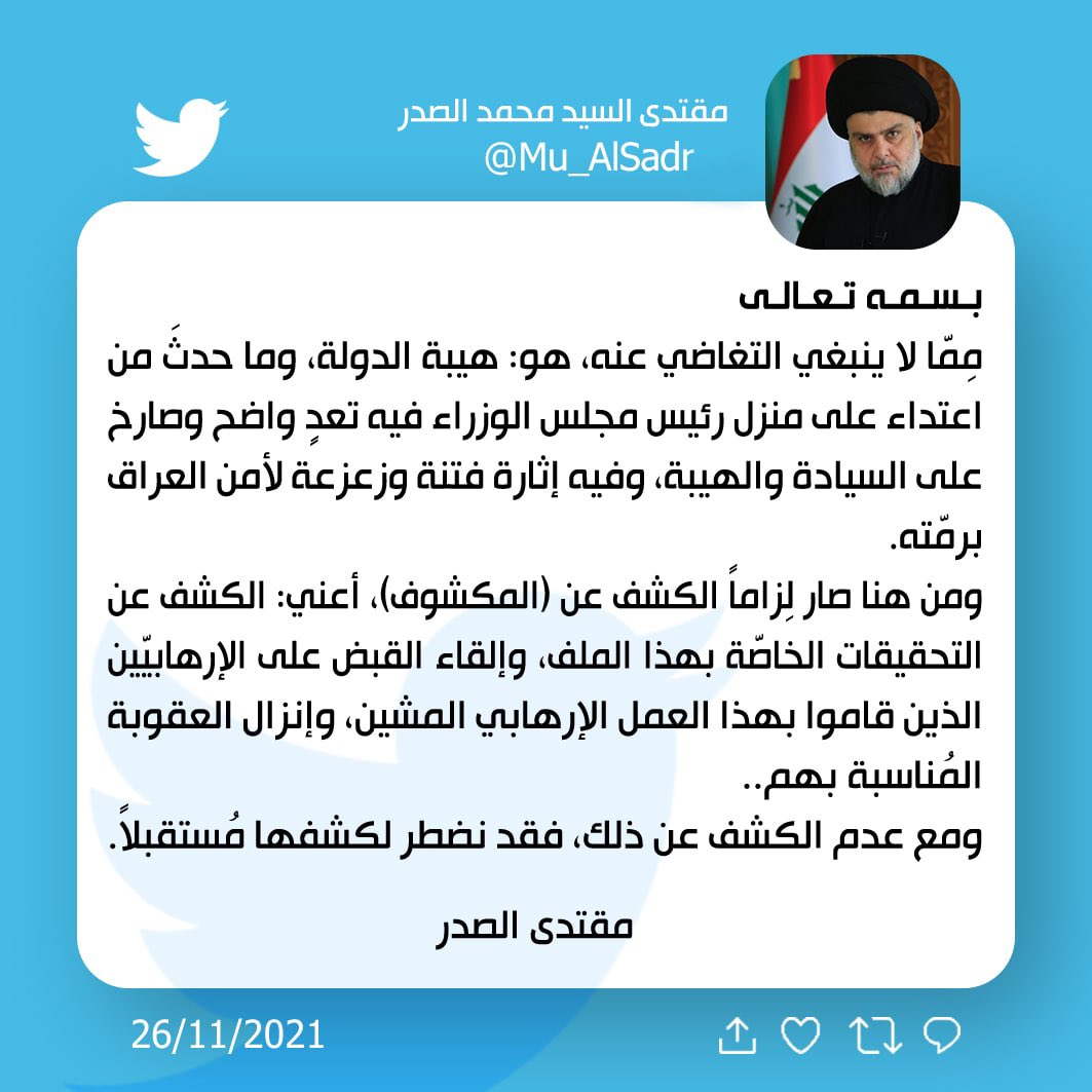 وتابع الصدر تغريدته: صار لازما الكشف التحقيقات الخاصّة باستهداف منزل رئيس الوزراء، وإلقاء القبض على الإرهابيّين الذين نفذوا هذا العمل الإرهابي المشين، وإنزال العقوبة المناسبة بهم.