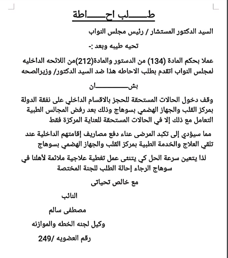 وطالب عضو مجلس النواب، وزارة الصحة- عبر طلب الإحاطة- بسرعة اتخاذ القرار المناسب بشأن وقف استقبال حالات نفقة الدولة بالقسم الداخلي بمركز القلب بسوهاج، قائلا: يجب عمل تغطية علاجية ملائمة لأهالي سوهاج من مرضى القلب.