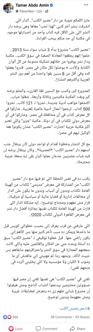 وكتب تامر عبده أمين على موقع التواصل الاجتماعي فيسبوك منشورًا يوضح فيه اعتزازه بالتعامل والتوقيع مع دار عصير الكتب في كتابه الأخير، موضحًا أن الخطوة لم تأتي إلا بعد حساباتٍ كثيرة، وجاء من ضمن نص المنشور: ويشهد ربنا ثم مهنيتي إني ملقتش أي ما يشوب لا الكيان ولا مؤسسيه ولا اللي يخليني أتردد في منحهم ثقتي، وثقتي في عصير الكتب هي نفسها ثقتي إن مصر فيها مسؤولين محترمين بيدعموا الشباب الناجح ومش هيقبلوا إن مشروع شبابي مُلهم زي ده يتعرض لمضايقات غريبة ومش مفهومة وبدون توضيح.