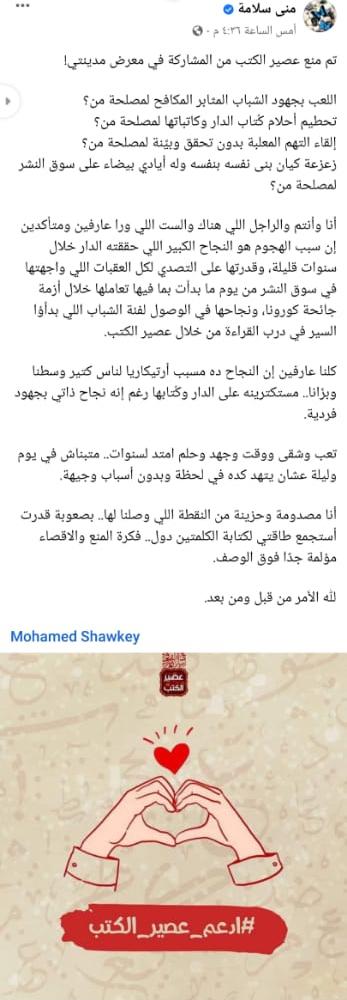 فيما نشرت الكاتبة منى سلامة على الحساب الشخصي لها بموقع التواصل الاجتماعي فيسبوك منشورًا تعبر فيه عن صدمتها إثر منع دار عصير الكتب من المشاركة في معرض مدينتي قائلة: تم منع عصير الكتب من المشاركة في معرض مدينتي