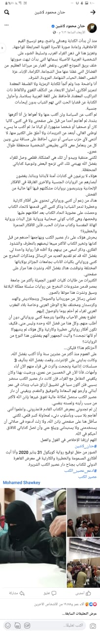 وجاء في نص المنشور: هناك من زعم أن كتبي ورواياتي تحتوي على أفكار كارثية وخطيرة تدمر الشباب، وذكر كتبي التي قدمتها لاتحاد الكتاب وحصلت على عضوية اتحاد الكتاب بعد اطلاعهم عليها وفحصها، وهي كتاب كوني صحابية، ورواية غزل البنات، ورواية الهالة المقدسة، وكتاب منارات الحب، فأين الأفكار المدمرة والخطيرة؟