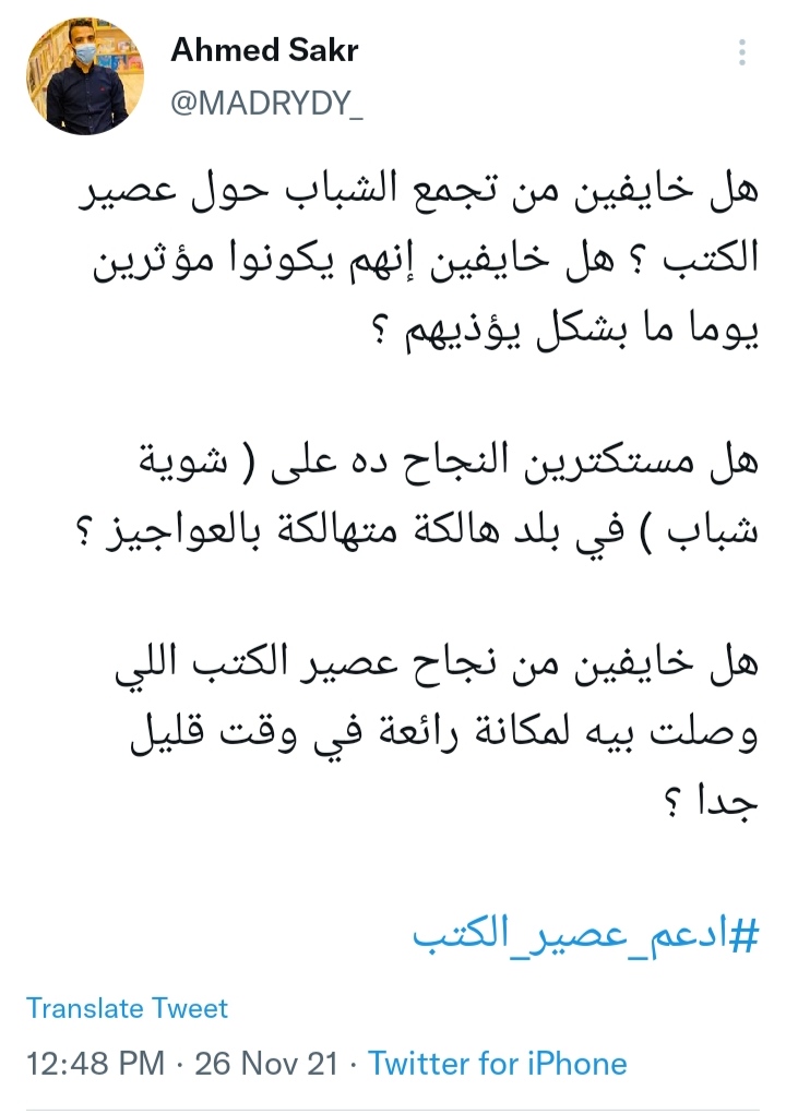 وكتب حساب باسم Ahmed Sakr على موقع التواصل الاجتماعي تويتر: هل خايفين من تجمع الشباب حول عصير الكتب ؟ هل خايفين إنهم يكونوا مؤثرين يوما ما بشكل يؤذيهم؟