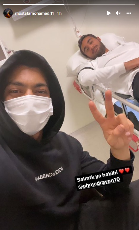 ونشر مصطفى محمد، عبر حسابه الشخصي على موقع الصور والفيديوهات القصيرة انستجرام، صورة له رفقة ريان من المستشفى، متمنيًا له التعافي والعودة السريعة إلى الملاعب بعد إصابته في لقاء الأمس، ومغادرته إلى المستشفى.