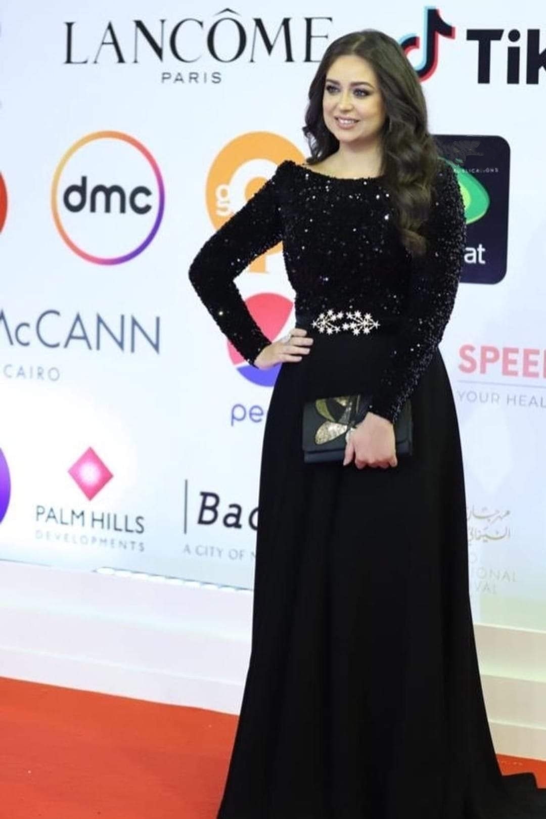 ودخلت الفنانة هبة مجدي على السجادة الحمراء مرتدية فستانا أسود طويلا غير مكشوف، ذا أكمام ضيقة يشغله اللون الفضي، وعلق جمهورها "دايما محترمة وجميلة".