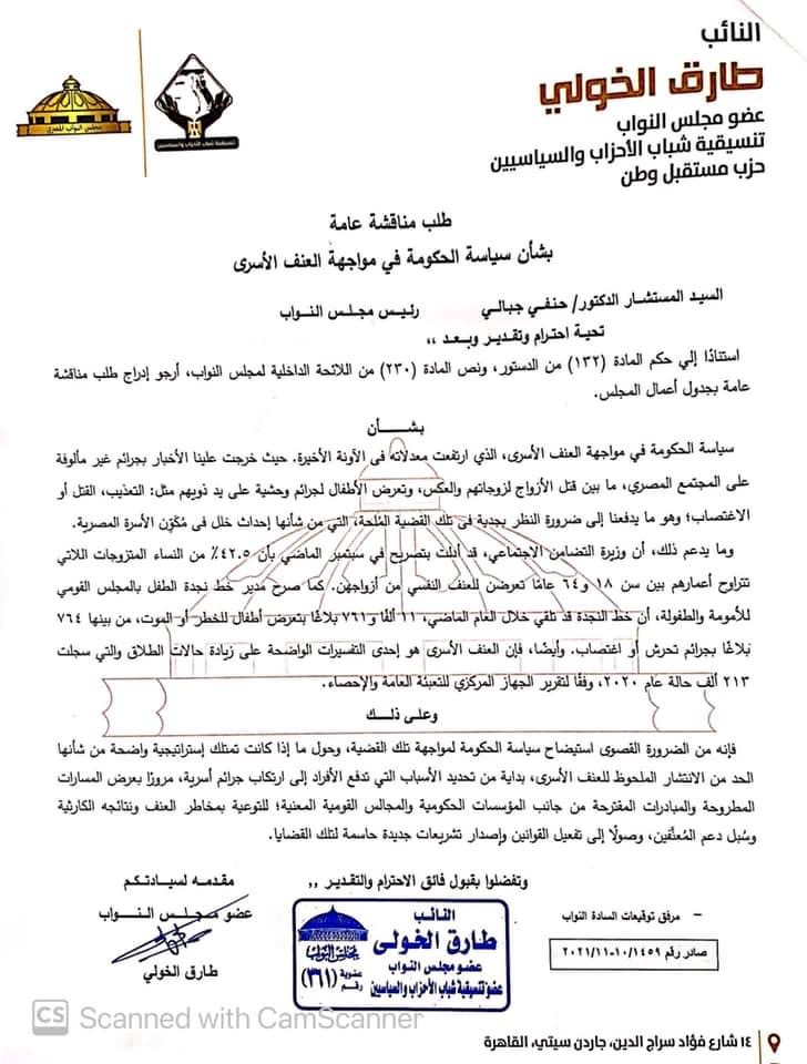 تقدم النائب طارق الخولي، عضو مجلس النواب، عن تنسيقية شباب الأحزاب والسياسيين، بطلب مناقشة عامة، بشأن سياسة الحكومة في مواجهة العنف الأسري، موجه للمستشار حنفي جبالي، رئيس مجلس النواب.