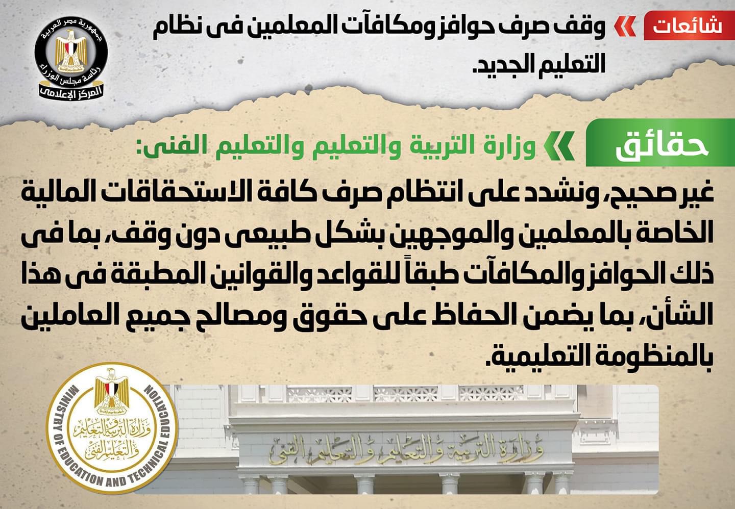 نفي المركز الإعلامي لمجلس الوزراء بالتواصل مع وزارة التربية والتعليم والتعليم الفني، ما انتشر في بعض المواقع الإلكترونية وصفحات التواصل الاجتماعي بشأن وقف صرف حوافز ومكافآت المعلمين في نظام التعليم الجديد.