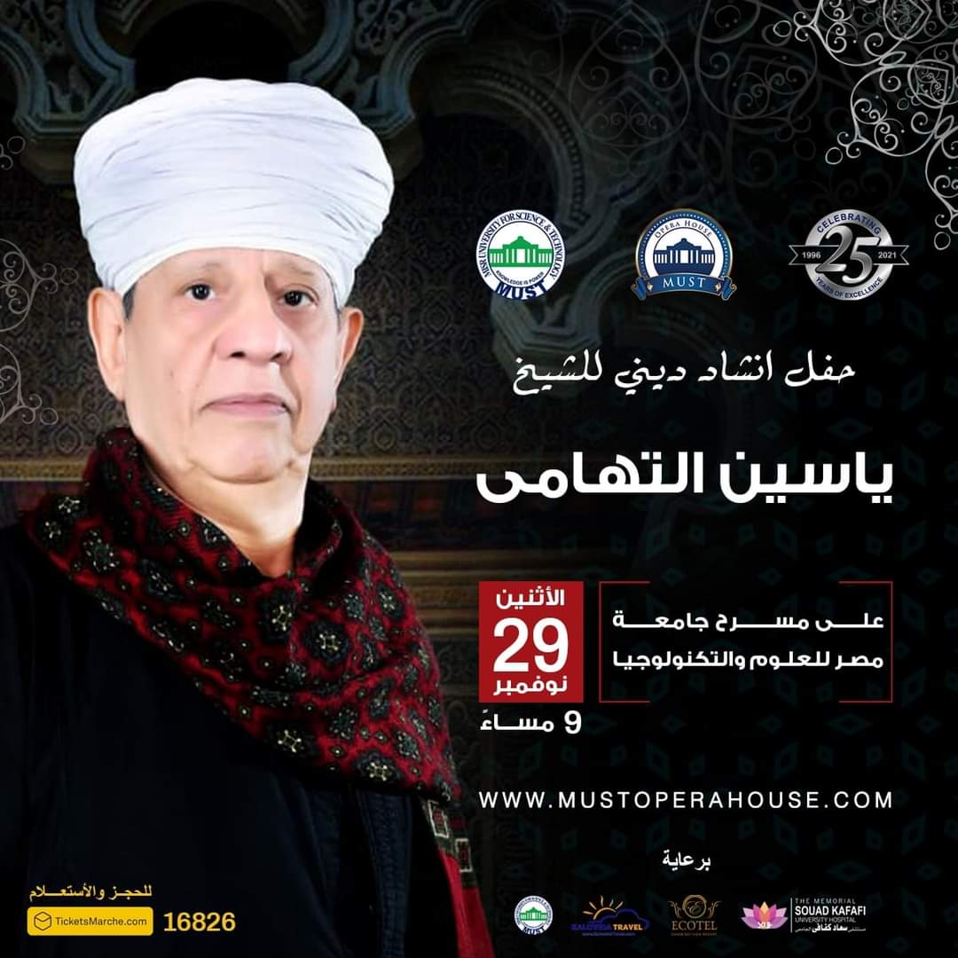 ويأتي حفل الشيخ ياسين التهامي على مسرح جامعة مصر للعلوم فى إطار الدور التنويري لجامعة مصر للعلوم والتكنولوجيا، حيث يعمل عميد المنشدين على خلق حالة من السمو الوجداني لترتقي المشاعر إلى عنان السماء، خلال انشاده أبيات الأشعار الصوفية والتراثية وقصائد المديح النبوي والابتهالات، والتي دائما ما يتفاعل معها الحضور.