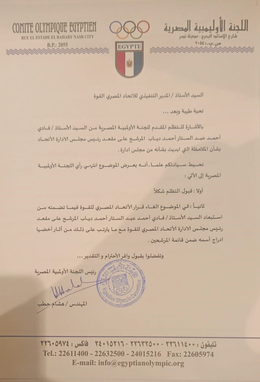 وبعد صدور قرار الاستبعاد، تقدم المهندس فادي دياب المرشح لرئاسة الاتحاد المصري للقوة البدنية ومصارعة الذراعين، بطعن في مركز التسوية والتحكيم الرياضي باللجنة الأوليمبية ضد قرار استبعاده.