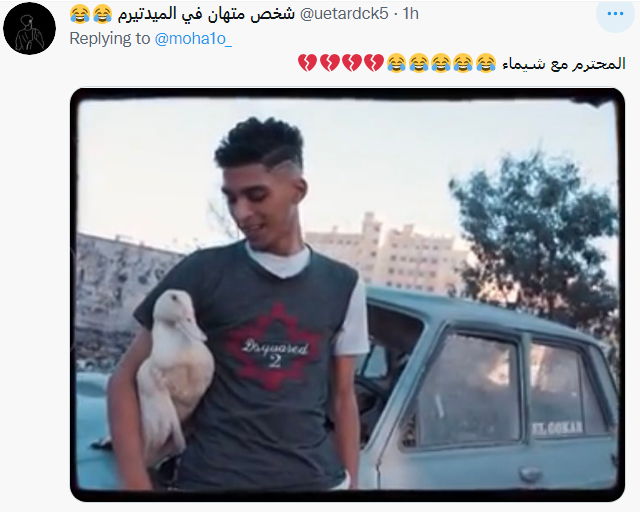 ونشر حساب آخر، صورة للمطرب بصحبة البطة، معلقًا عليها: المحترم مع شيماء، مستخدمًا إيموجي القلب المكسور والضحك.