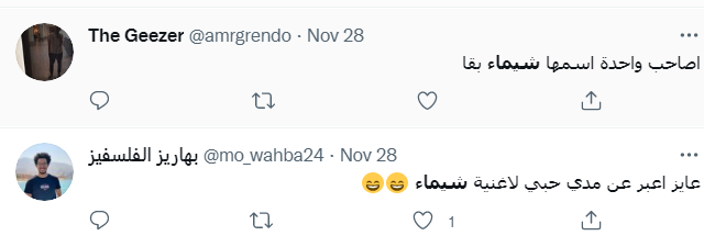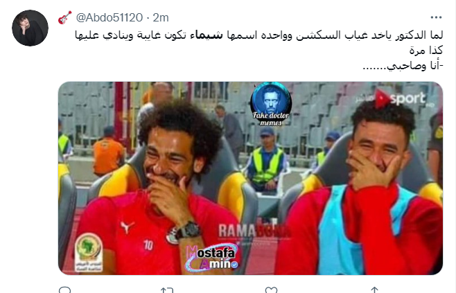 وكتبت شيماء عبده: قولي مالها شيماء.. فيما نشر حساب آخر، صورة للاعب محمد صلاح وترزيجيه، وهم يضحكان، وكتب عليها: لما الدكتور ياخد غياب السكشن وواحدة اسمها شيماء تكون غايبة وينادي عليها كذا مرة.. أنا وصاحبي، ونشر حساب باسم محمد: شيماء طلعت بطة.