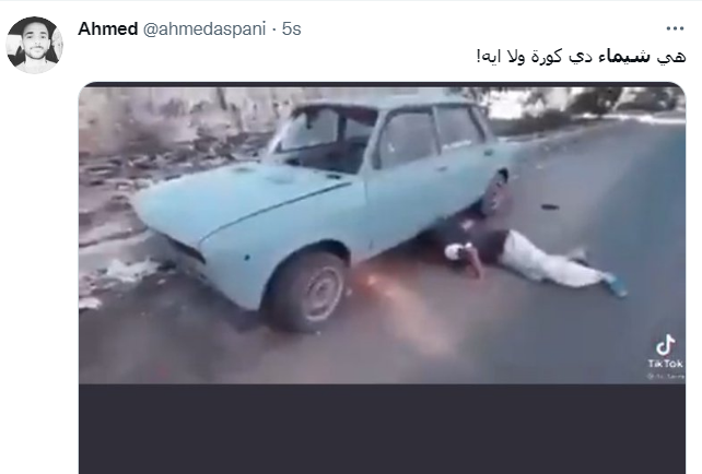 ونشر آخر صورة للمطرب وهو نائم تحت سيارة، معلقًا عليها: هي شيماء دي كورة ولا ايه؟.
