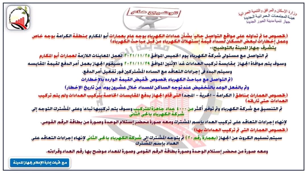 أما بخصوص العمارات بمناطق ( الـكـرامـة - الحرية - المجـد) التي دفع الجهاز قيمة المقايسات الخاصة بتركيب عدادات لها، ولم يتم تركيبها حتى تاريخه، فتم التنسيق مع شركة الكهرباء وتوفير أكثر من 4000 عداد جاهزة للتركيب وسوف يتم تركيبها تباعًا، وعلى المشترك الـتـوجـه إلى شركة الكهرباء بالحي الثاني لإنهاء إجراءات التعاقد على تركيب العداد باسم المشترك، ومـعـه صـورة مـحـضـر استلام الـوحـدة وصورة من بطاقة الرقم القـومي.