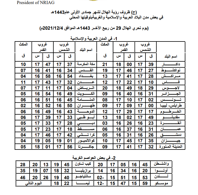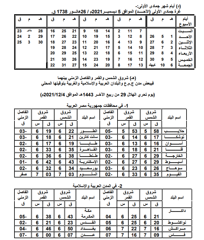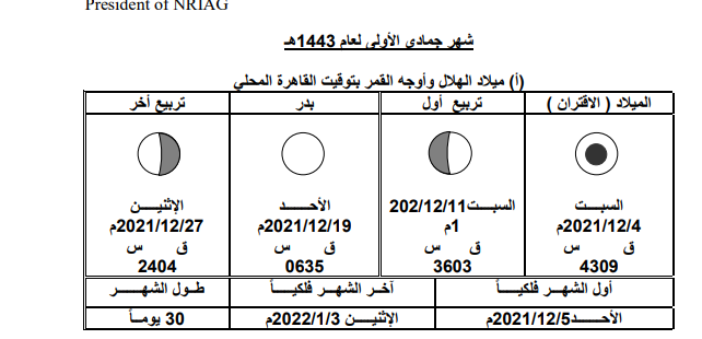 صرح الدكتور جاد القاضي، رئيس المعهد القومي للبحوث الفلكية والجيوفيزيقية، بأنه طبقا للحسابات الفلكية التي يقوم بها المعهد، فإن هلال شهر جمادى الأولى سوف يولد مباشرة بعد حدوث الاقتران في تمام الساعة التاسعة والدقيقة 43 صباحا بتوقيت القاهرة، يوم السبت 29 من ربيع الآخر 1443هجري الموافق 4 ديسمبر 2021، وذلك يوم الرؤية.