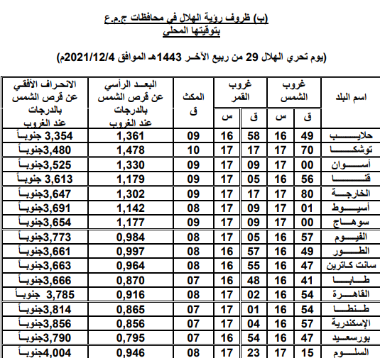 وفيما يلي بيان مُفصل عن ظروف رؤية الهلال، وأوجه القمر في مدينة القاهرة ومحافظات جمهورية مصر العربية، وبعض العواصم العربية والإسلامية والغربية يوم تحري الهلال.