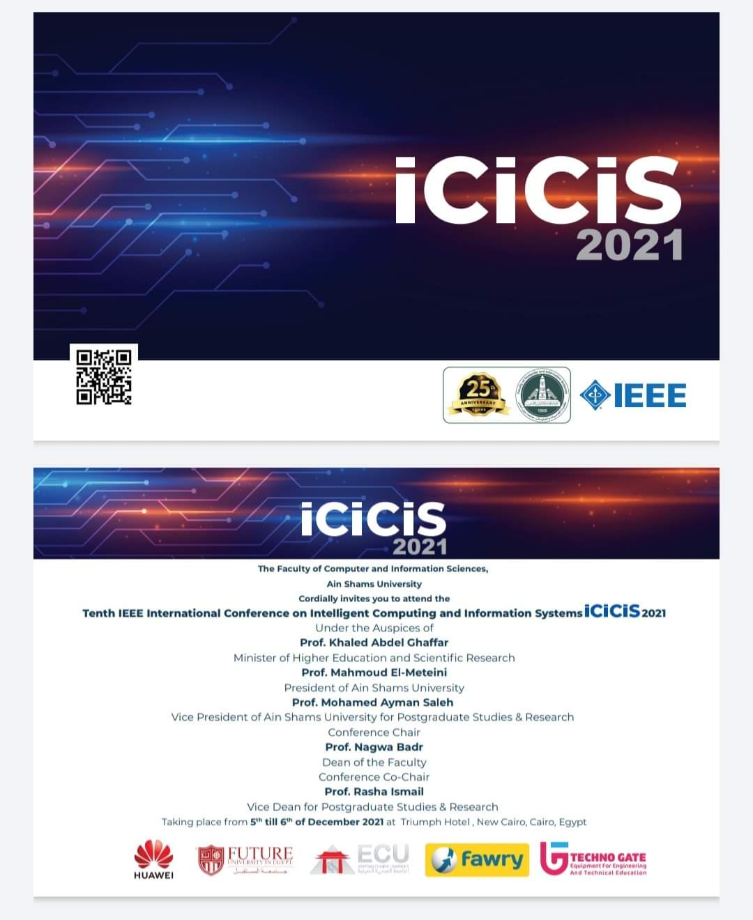 أعلنت كلية الحاسبات والمعلومات بجامعة عين شمس عن انعقاد مؤتمرها الدولي العاشر للحوسبة الذكية ونظم المعلومات يومى 5-6 ديسمبر 2021 بفندق تريومف التجمع الخامس، وذلك تحت رعاية الدكتور محمود المتينى رئيس الجامعة والدكتور محمد أيمن صالح نائب رئيس الجامعة لشئون الدراسات العليا والبحوث وتحت اشراف الدكتورة نجوى بدر عميد الكلية ورئيس المؤتمر، والدكتورة رشا إسماعيل وكيل الكلية للدراسات العليا والبحوث ونائب رئيس المؤتمر.