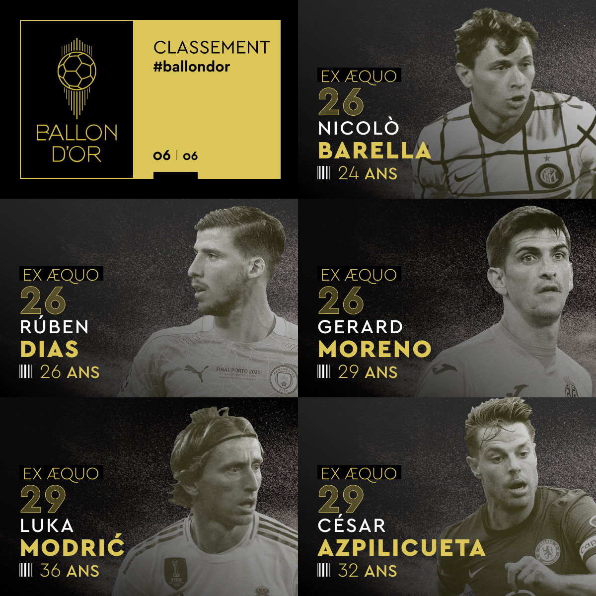 وجاء الثنائي لوكا مودريتش لاعب ريال مدريد، وسيزر أزبيلكوتا لاعب تشيلسي الإنجليزي، في المركز الـ 29 بترتيب الكرة الذهبية، بينما جاء الثلاثي روبن دياز لاعب مانشستر سيتي، وجيرارد مورينو لاعب فياريال، ونيكولو باريلا لاعب إنتر ميلان في المركز الـ 26، وفيل فودين لاعب مانشستر سيتي في المركز الـ 25، وبيدري لاعب برشلونة في المركز الـ 24.