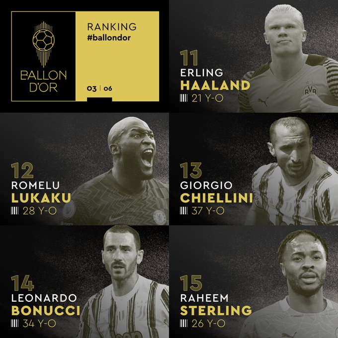 واحتل الإنجليزي رحيم ستيرلينج مهاجم فريق مانشستر سيتي المركز الخامس عشر، فيما احتل ليوناردو بونوتشي مدافع يوفنتوس المركز الـ 14، واحتل جورجيو كيليني المركز الـ 13، وذلك خلف الدبابة البلجيكية روميلو لوكاكو نجم فريق تشيلسي الذي احتل المركز الثاني عشر من قائمة ترتيب الكرة الذهبية.