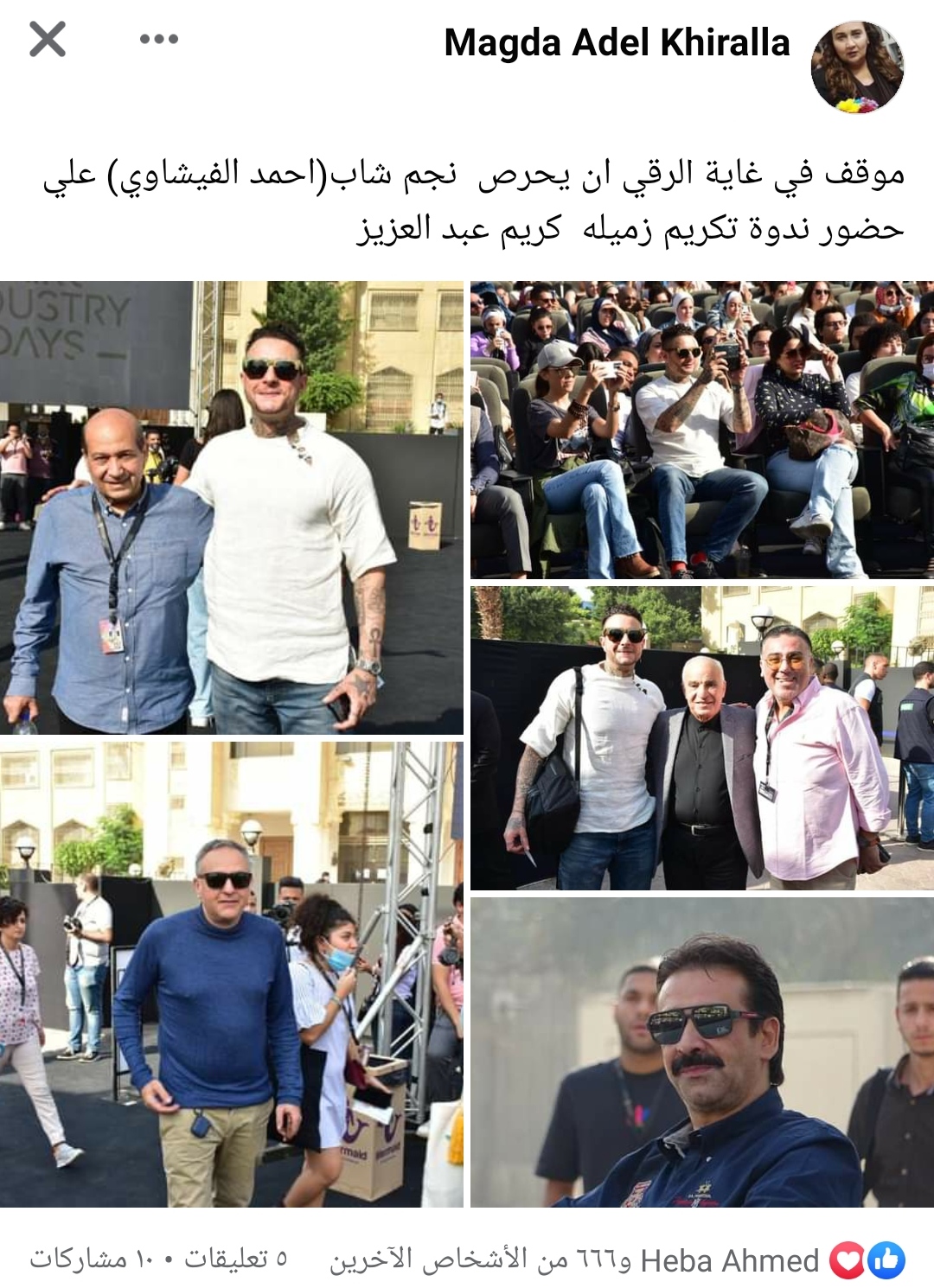 وكتبت ماجدة منشورًا، عبر حسابها الشخصي بموقع التواصل الاجتماعي فيس بوك، قائلة: موقف في غاية الرقي أن يحرص نجم شاب أحمد الفيشاوي، على حضور ندوة تكريم زميله كريم عبد العزيز.