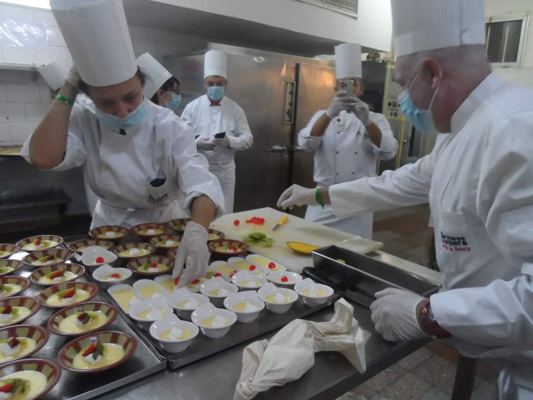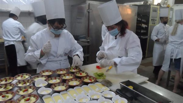 وحرص ما يقرب من 15 سائحًا من مختلف الجنسيات، مرتدين ملابس الطهي، على مشاركة الطهاة الموجودين في الفندق في إعداد وتجهيز وجبة الغداء، لتعلم تحضير الأكلات المصرية.