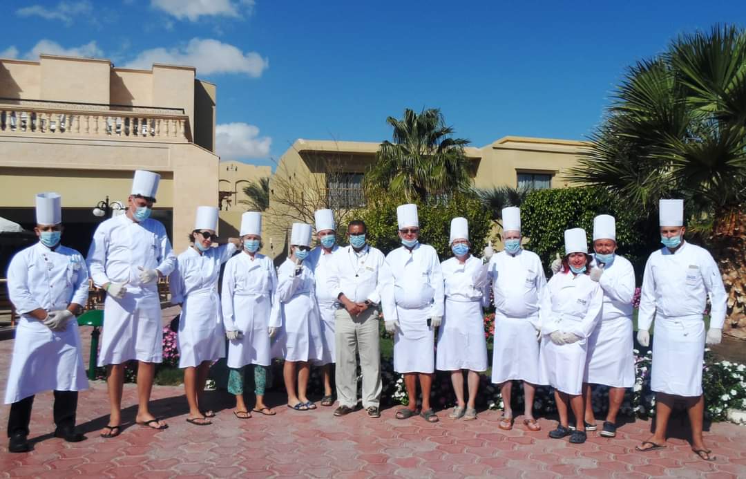 في لقطة طريفة، شارك عدد من السياح بأحد المنتجعات السياحية بمدينة مرسى علم جنوب محافظة البحر الأحمر، في عملية الطهى بأحد الفنادق.