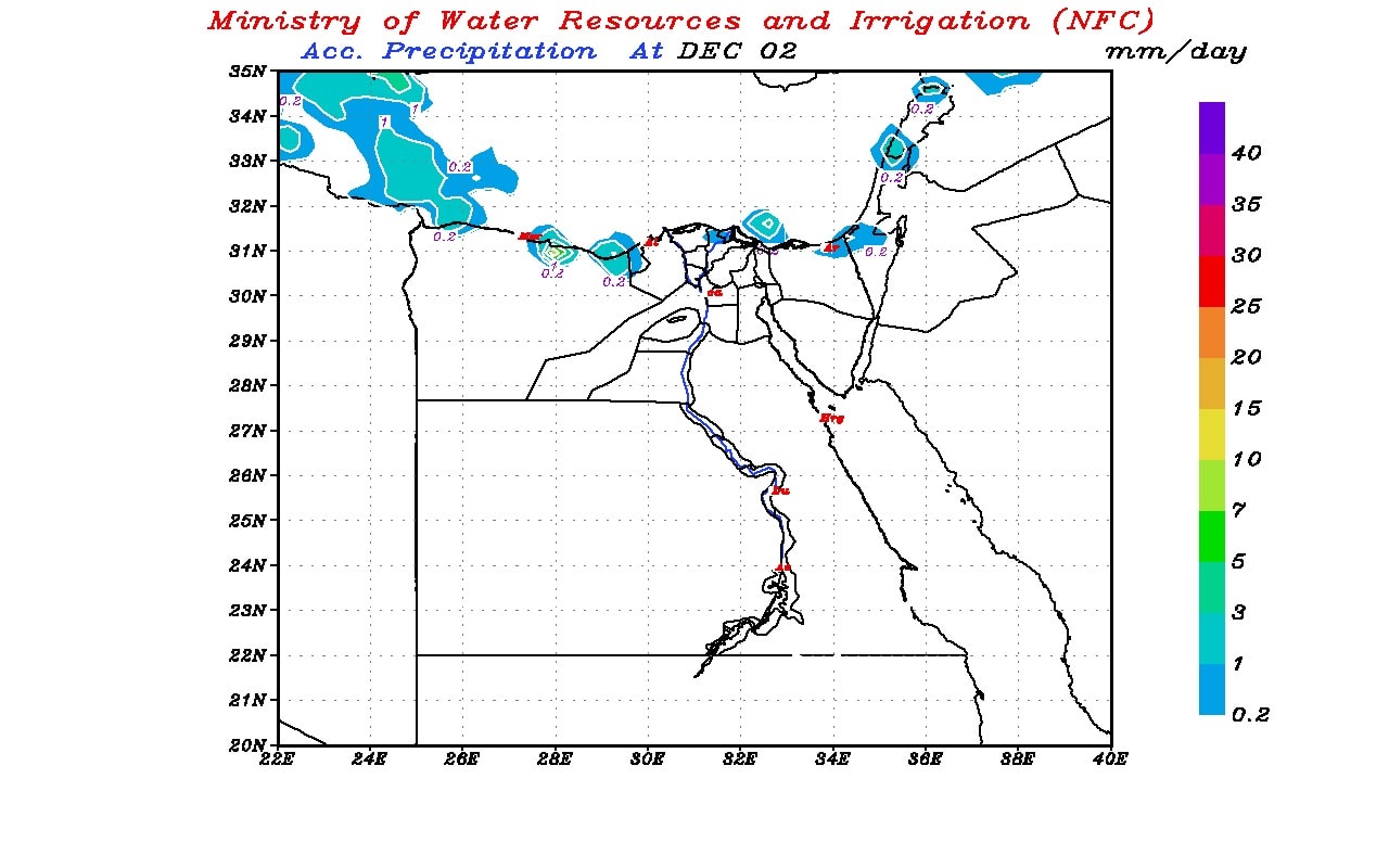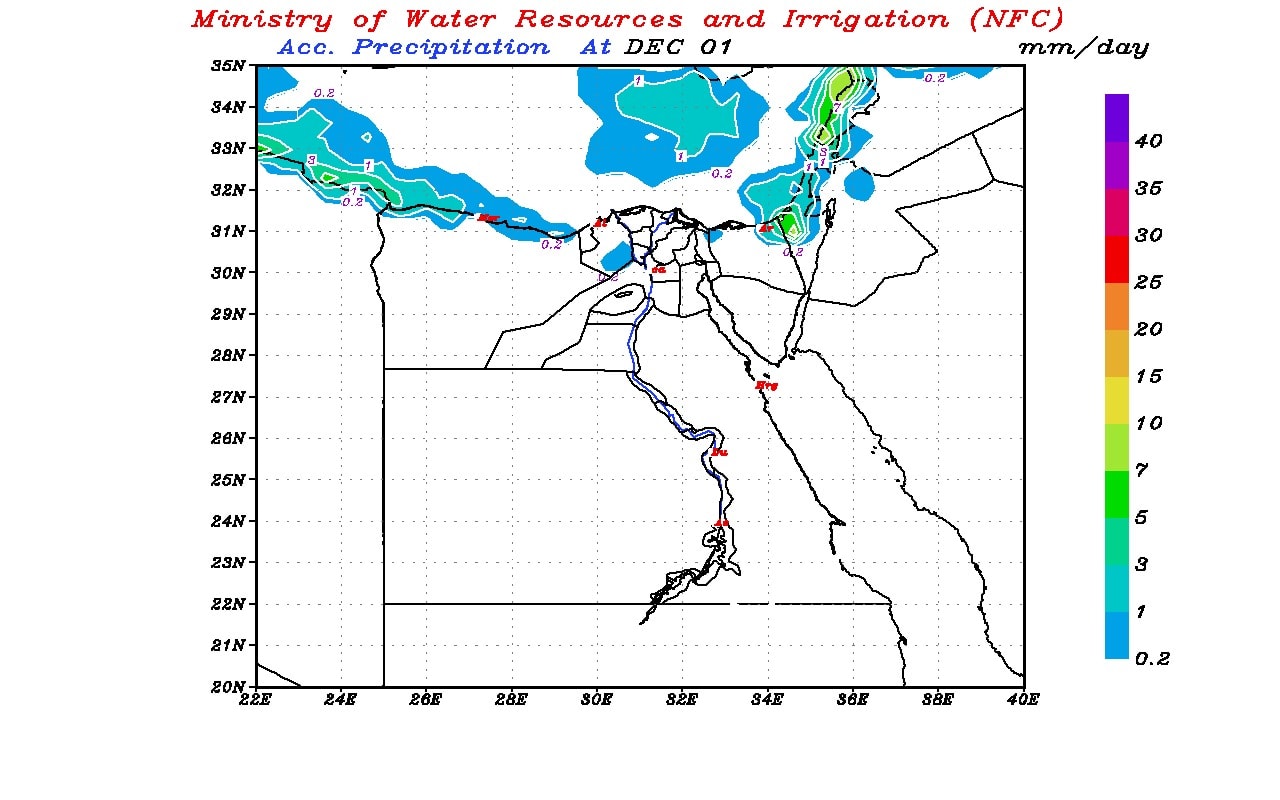 وأشار مركز التنبؤ بفيضان النيل إلى أن اليوم، 30 نوفمبر سيشهد احتمالية سقوط أمطار خفيفة على أجزاء من السواحل الشمالية الغربية.