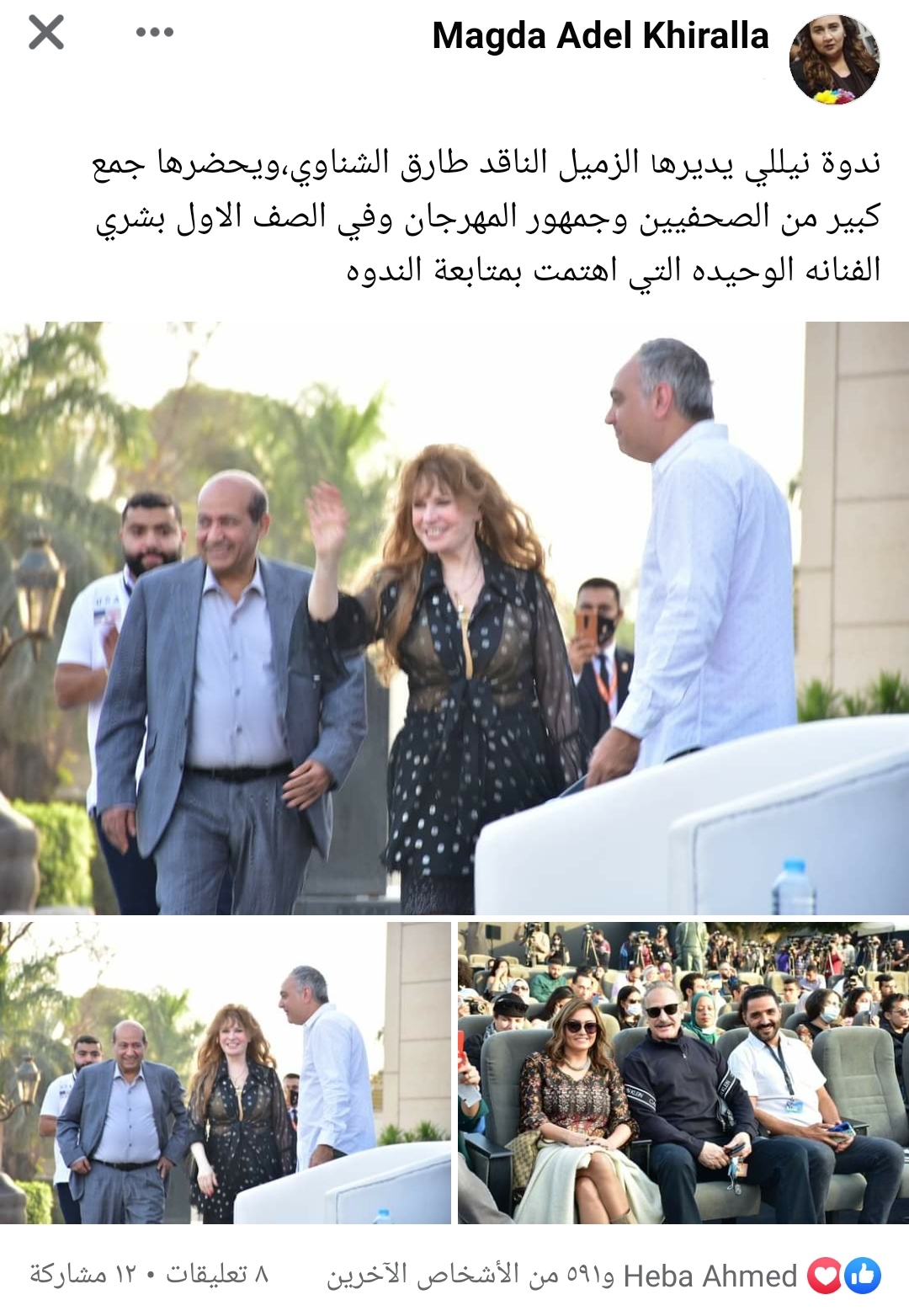 وكتبت ماجدة خير الله منشورا، عبر حسابها الشخصي بموقع التواصل الاجتماعي فيس بوك، قائلة: ندوة نيللي يديرها الزميل الناقد طارق الشناوي، ويحضرها جميع الصحفيين، وجمهور المهرجان في الصف الأول بشرى، الفنانة الوحيدة التي اهتمت بتابعة الندوة.