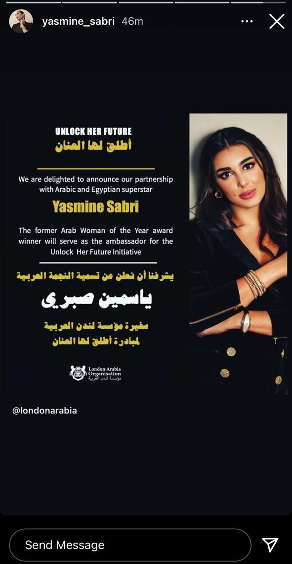 حصلت الفنانة ياسمين صبري اليوم على لقب سفيرة مؤسسة لندن العربية، وذلك لمبادرة أطلق لها العنان، ونشرت ياسمين ستوري عبر حسابها بموقع تبادل الصور والفيديوهات انستجرام كشفت فيها حصولها على هذا اللقب.