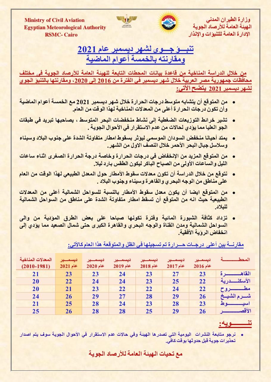من المتوقع المزيد من الانخفاض في درجات الحرارة وخاصة درجة الحرارة الصغرى أثناء ساعات الليل والساعات الأولى من الصباح الباكر ليكون الطقس باردا ليلا، كما تتوقع الهيئة من خلال الدراسة أن تكون معدلات سقوط الأمطار حول المعدل الطبيعي لهذا الوقت من العام على مناطق من الوجه البحري والقاهرة وسيناء وجنوب البلاد.