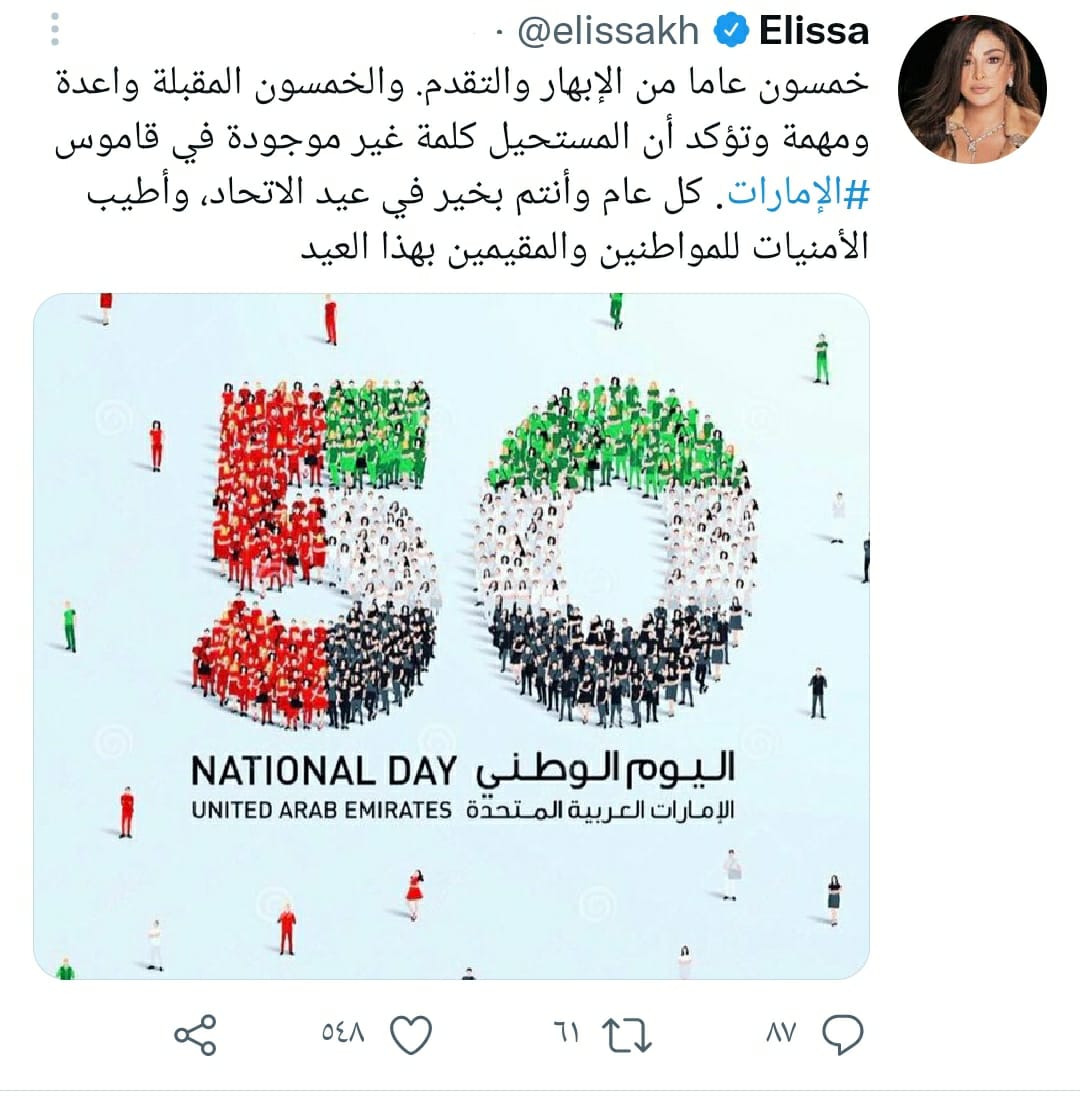 كتبت إليسا تغريدة، عبر حسابها الشخصي بموقع التدوينات القصيرة تويتر، مغردةً: خمسون عامًا من الإبهار والتقدم، والخمسون المقبلة واعدة ومهمة وتؤكد أن المستحيل، كلمة غير موجودة في قاموس الإمارات، كل عام وأنتم بخير، في عيد الاتحاد، وأطيب الأمنيات للمواطنين والمقيمين بهذا العيد.