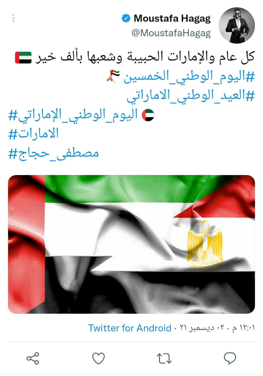وأعرب المطرب مصطفى حجاج عن حبه الكبير لدولة الإمارات العربية الشقيقة، حيث حرص أن يشاركهم بالاحتفال بهذا اليوم، وكتب تغريدة عبر موقع التدوينات تويتر، قال فيها: كل عام والإمارات الحبيبة وشعبها بألف خير.