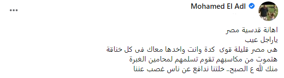 وكتب محمد العدل عبر حسابه الشخصي بموقع التواصل الاجتماعي فيس بوك: إهانة قدسية مصر، يا راجل عيب، هي مصر قليلة قوي كده وأنت واخدها معاك في كل خناقة، هتموت من مكاسبهم تقوم تسلمهم لمحامين الغبرة، منك لله ع الصبح، خلتنا ندافع عن ناس غصب عننا.