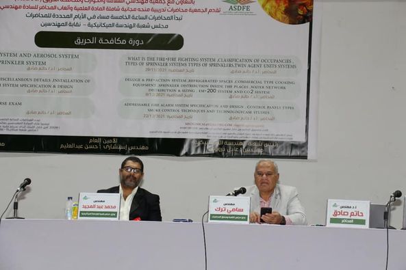 وأشار المهندس سامي ترك، إلى أن هذه المحاضرة هي المحاضرة الثانية لدورة مكافحة الحريق، موضحًا أن الدورة تهدف إلى تنمية المهارات الهندسية في مجال مكافحة الحريق لأعضاء النقابة، وخاصة حديثي التخرج، لما لها من أهمية لرفع مستواهم المهاري وتنمية هذا المجال في المشاريع التنموية للدولة.