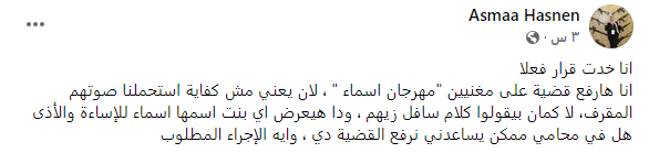 وكتبت أسماء حسين عبر حسابها الشخصي بموقع التواصل الاجتماعي فيسبوك: أنا خدت قرار فعلا، أنا هارفع قضية على مغني مهرجان أسماء، لأنه يعني مش كفاية استحملنا صوتهم المقرف، لا كمان بيقولوا كلام سافل زيهم، ودا هيعرض أي بنت اسمها أسماء للإساءة والأذى، هل في محام ممكن يساعدني نرفع القضية دي، وإيه الإجراء المطلوب.