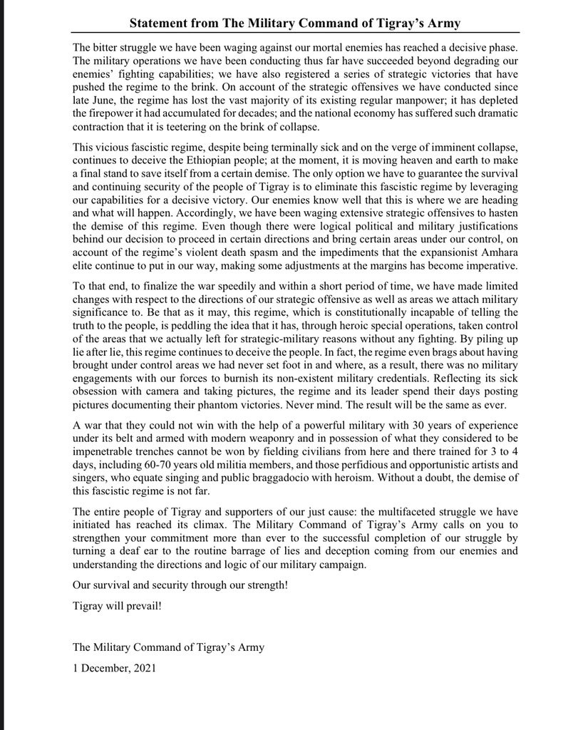 قالت قوات تيجراي في بيانها، إن الحرب التي تخوضها الجبهة مع ألد أعدائها الحكومة الإثيوبية، وصلت إلى مرحلة حاسمة، حيث أن العمليات العسكرية التي تقودها قوات تيجراي تمكنت ليس فقط من إضعاف قوات إثيوبيا بل أيضًا تحقيق سلسلة من الانتصارات الاستراتيجية من شأنها جر الجيش الإثيوبي إلى حافة الهاوية.