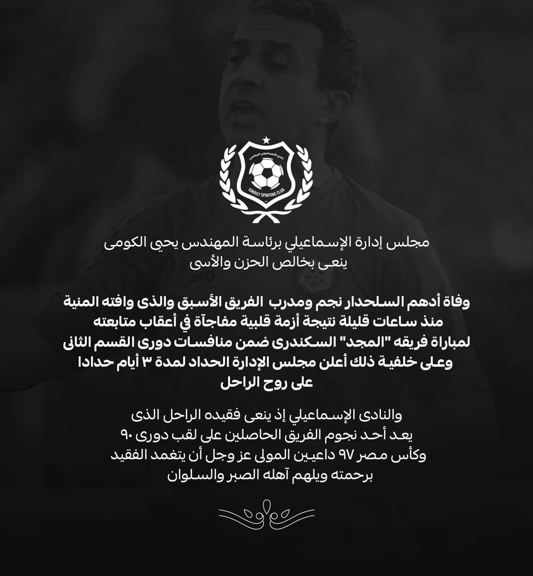 الإسماعيلي ينعى أدهم السلحدار ويعلن الحداد 3 أيام
