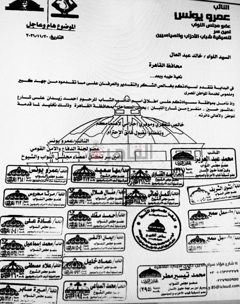 17 برلمانيا يطالبون محافظ القاهرة بإطلاق اسم النائب أحمد زيدان على أحد الشوارع