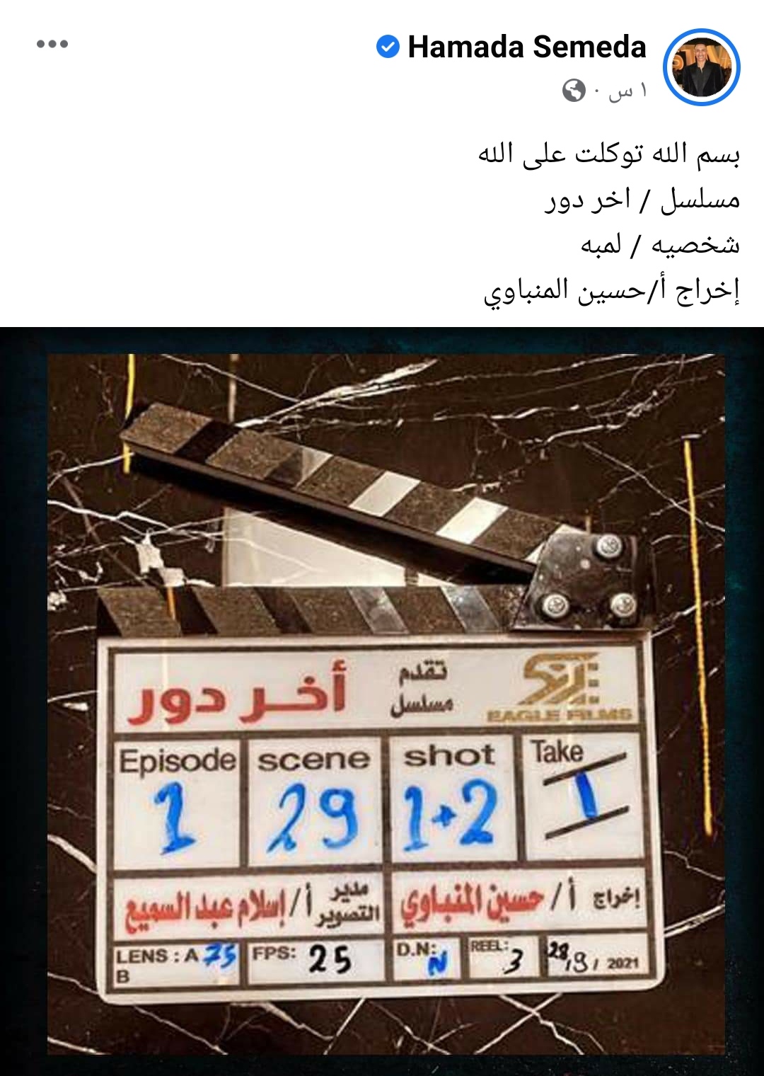 وكتب حمادة صميدة منشورًا، عبر حسابه الشخصي بموقع التواصل الاجتماعي فيس بوك، قال فيه: بسم الله توكلت على الله، مسلسل أخر دور شخصية لمبة، إخراج حسين المنباوي.